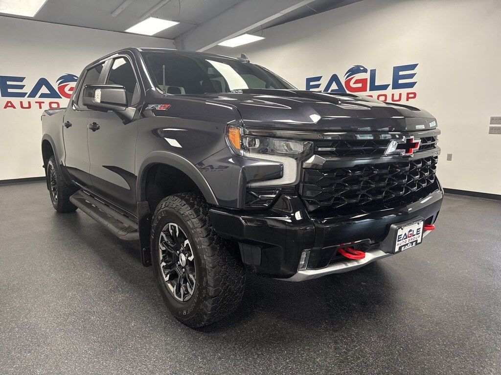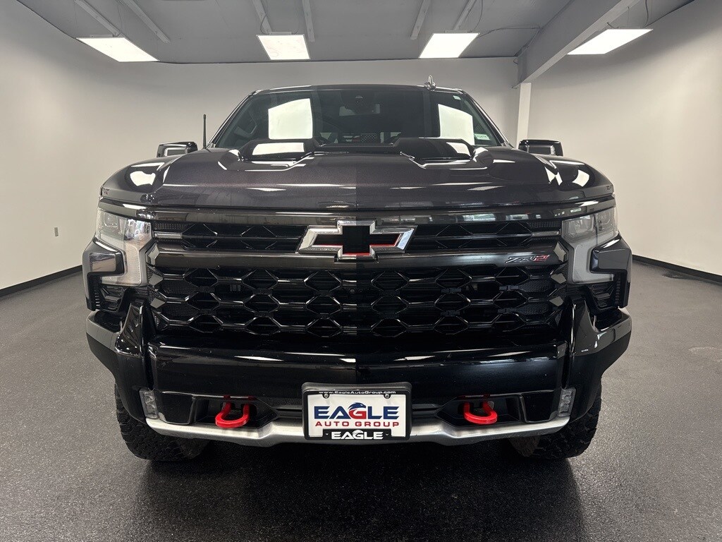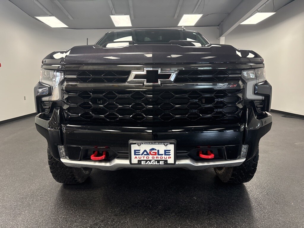Clean CARFAX. Dark Ash Metallic 2022 Chevrolet Silverado 1500 ZR2 4WD 10-Speed Automatic EcoTec3 6.2L V8 4X4, Heated Seats, Alloy Wheels, Remote Start, Cruise Control, BlueTooth Compatible, Reverse Back up Camera, 10-Speed Automatic, 4WD, Jet Black/Graystone Leather, 10-Way Power Driver Seat w/Lumbar, 10-Way Power Passenger Seat Adjuster w/Lumbar, 12.3" Multicolor Reconfigurable Digital Display, 120-Volt Bed Mounted Power Outlet, 120-Volt Instrument Panel Power Outlet, 170 Amp Alternator, 2 USB Data Ports, 2nd Row Heated Outboard Seats, All-Weather Floor Liner (LPO), Auto-Dimming Inside Rear-View Mirror, Auto-Locking Rear Differential, Bed View Camera, Bluetooth® For Phone, Chevrolet Connected Access Capable, Chevytec Spray-On Black Bedliner, Color-Keyed Carpeting Floor Covering, Compass, Deep-Tinted Glass, Driver Memory, Dual Exhaust, Dual Rear USB Ports (Charge Only), Electric Rear-Window Defogger, Electrical Steering Column Lock, Electronic Cruise Control, EZ Lift Power Lock & Release Tailgate, Floor Mounted Center Console, Front LED Fog Lamps, Front Rainsensing Wipers, HD Surround Vision, Heated Driver & Front Outboard Passenger Seats, Heated Steering Wheel, Heavy-Duty Air Filter, High Gloss Black Mirror Caps, Hill Descent Control, Hitch Guidance, Hitch Guidance w/Hitch View, Integrated Trailer Brake Controller, Keyless Open & Start, Leather Wrapped Steering Wheel, LED Cargo Area Lighting, Manual Tilt/Telescoping Steering Column, OnStar & Chevrolet Connected Services Capable, Outside Heated Power-Adjustable Mirrors, Performance Red Recovery Hooks, Perimeter Lighting, Power Front Passenger Windows w/Express Up/Down, Power Front Windows w/Driver Express Up/Down, Power Rear Windows w/Express Down, Power Sliding Rear Window w/Rear Defogger, Preferred Equipment Group 3LT, Rear Cross Traffic Alert-Braking, Rear Park Assist, Rear Pedestrian Detection, Rear Wheelhouse Liners, Remote Vehicle Starter System, Safety Alert Seat, SiriusXM w/360L, Standard Tailgate, Steering Wheel Audio Controls, Theft Deterrent System (Unauthorized Entry), Trailer Camera Provisions, Trailer Side Blind Zone Alert, Trailering App, Trailering Package, Universal Home Remote, Up-Level Rear Seat w/Storage Package, Ventilated Driver & Front Passenger Seats, Wi-Fi Hot Spot Capable, Wireless Charging, Wireless Phone Projection, ZR2 Suspension Package.
