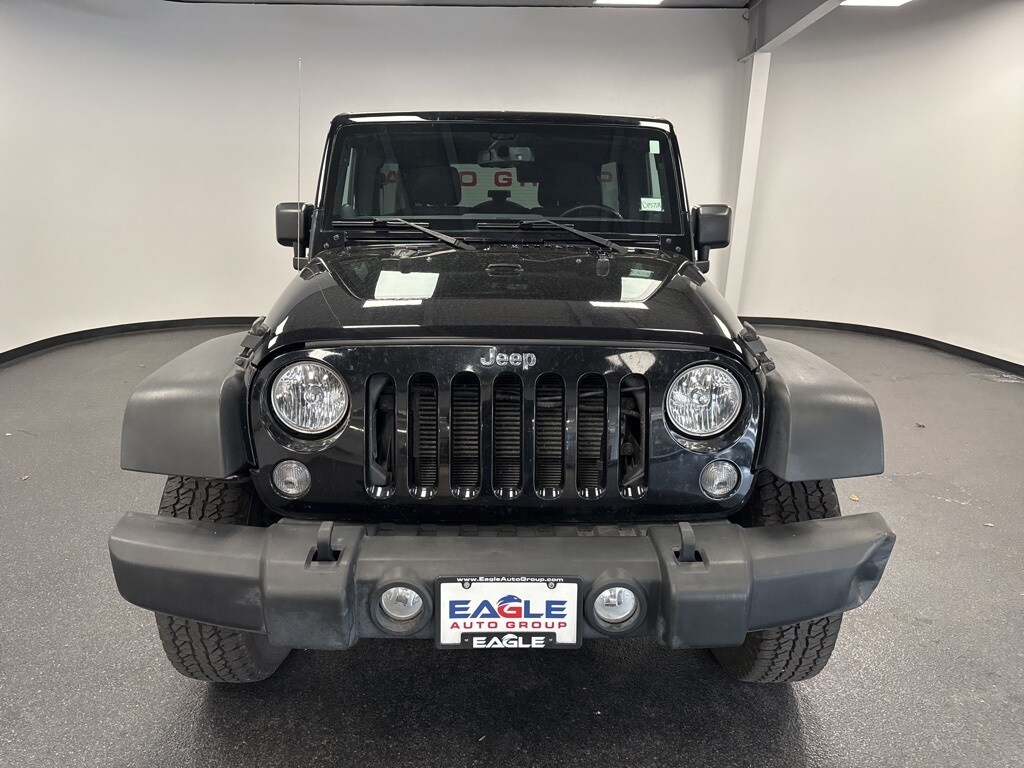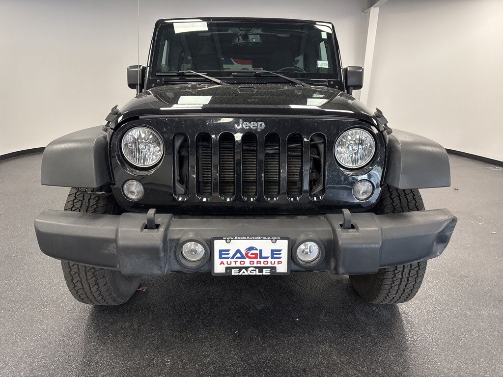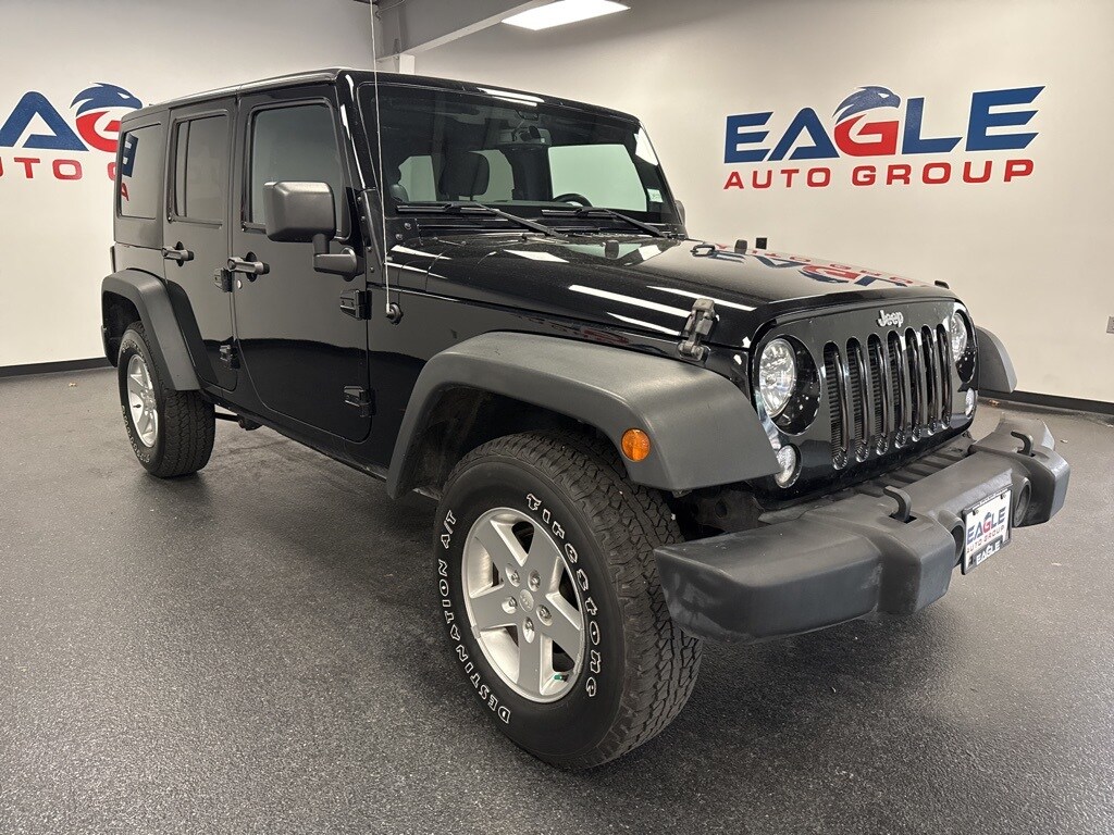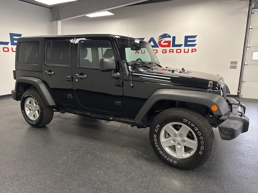 Clean CARFAX. Black Clearcoat 2014 Jeep Wrangler Unlimited Sport 4WD 5-Speed Automatic 3.6L V6 24V VVT 4X4, Auto-Dimming Mirror w/Reading Lamp, Chrome/Leather Wrapped Shift Knob, Connectivity Group, Deep Tint Sunscreen Windows, Leather Wrapped Steering Wheel, Quick Order Package 24S, Remote USB Port, Tire Pressure Monitoring Display, Uconnect Voice Command w/Bluetooth, Vehicle Information Center.